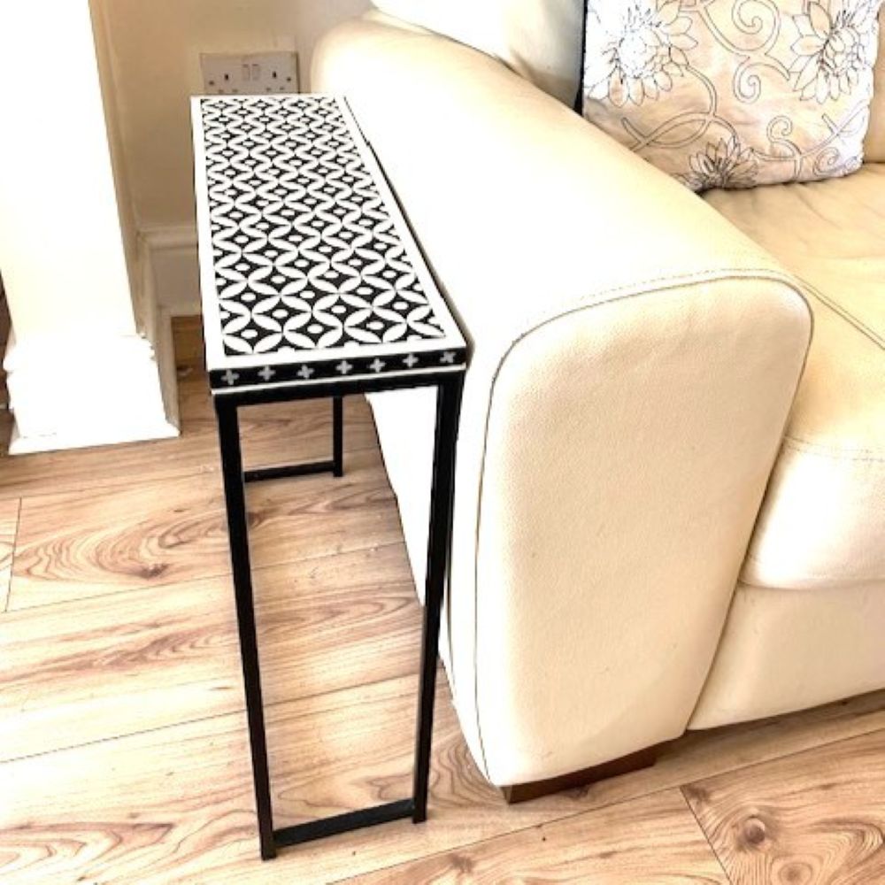 Description : A very practical & beautiful inlay work side table is made by skilled craftsmen. Base material is MDF and is covered with resin inlay work. Size; Top 6''x20'' & H 24''